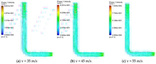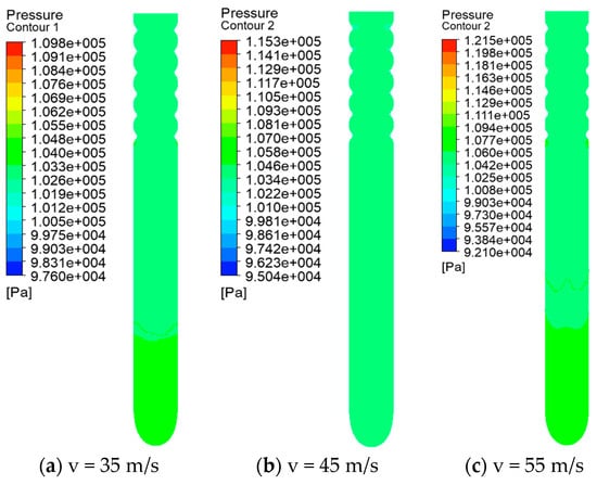 The pressure distribution within the pressurized tube under different inlet airflow velocities is shown in Figure 7. In the straight section of the pressurized tube, the pressure variation is relatively small at different inlet airflow velocities. However, with an increase in inlet airflow velocity, the pressure difference in the straight section shows an initial increase followed by a decrease. Therefore, it is necessary to choose an appropriate inlet airflow velocity to reduce unnecessary energy consumption.