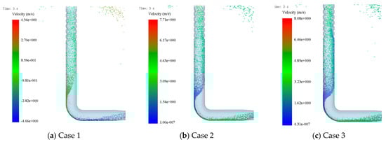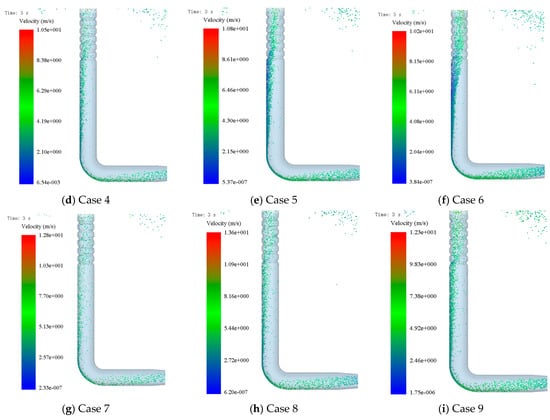The distribution of seeds within the pressurized tube is shown in Figure 8 under different inlet airflow velocities and seeding quantities. In the straight section, some seeds initially move along the outer side of the vane’s wall. As the airflow acts on the seeds, they accelerate and gradually disperse throughout the entire pressurized tube. After passing through the corrugated section of the pressurized tube, the presence of corrugations causes an increase in seed velocity. The disturbance from the corrugations ensures that seeds are uniformly distributed in the middle part of the corrugated section, thus ensuring the uniformity of seed flow into the distribution head.