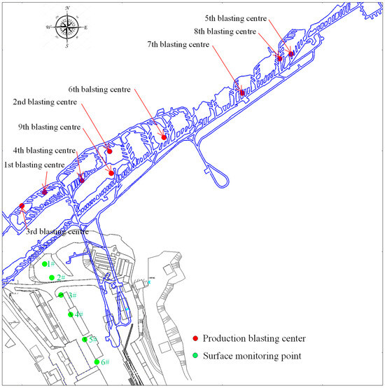 Distribution of monitoring points on the surface and blasting centers in the subsurface.