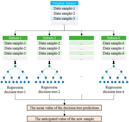 The Random Forest algorithm [37,38] represents a novel machine learning approach capable of integrating predictions from multiple decision trees with exceptional accuracy. First, the bootstrap [39] sampling technique with replacement is applied to randomly extract k subsets from the original dataset, with each subset comprising 2/3 of the original dataset, thus averting overfitting. Second, regression decision trees are derived from the random subsets, leading to the formation of a forest consisting of k regression decision trees. During the development of each tree, m features (m ≤ N) are randomly chosen from all N feature variables, and the optimal attribute for internal node branching is determined based on the minimum Gini coefficient principle. Each branch represents the output subset of a specific value range in the characteristic attribute test. Third, the prediction outcomes of the k decision trees are merged, and the mean value of the decision tree predictions establishes the anticipated value of the new sample. In each sampling iteration, approximately 1/3 of the data remains untouched, and these out-of-bag (OOB) data are utilized for internal error estimation (OOB error). The RF method enhances the prediction accuracy of the model without significantly escalating the computational load. Moreover, the introduction of randomness heightens the dissimilarities between the trees, thereby augmenting the model’s generalization capability (Figure 5).