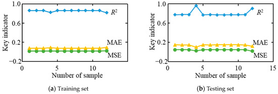 To process the 41 sets of blasting test data, 35 sets derived from the first seven long hole blasting events constituted the training set, and the remaining six sets from the eighth and ninth events were designated as the test set, all of which underwent normalization. The radial basis function was chosen as the kernel function, and the MSE served as the initial fitness metric for the model. Employing the PSO intelligent algorithm with parameters detailed in Table 2, 5-fold cross-validation technology was applied. The 35 training datasets were randomly split into five groups, with four groups utilized for training and one group for model verification. This process was repeated five times, optimizing the model using the C and g resulting in the smallest MSE. The PSO-SVR model was employed for predictions involving 12 mass point peak vibration velocities. The optimized model yielded C ranging from 1.8746 to 170.8970 and g ranging from 0.1957 to 4.2967 (Table 3). Interestingly, penalty factor C and kernel function deviation g exhibited a negative correlation, with an R2 of 0.6011. Utilizing these optimized parameters, an SVR model was constructed. Predictions were made for both the training and test sets, and comparisons were drawn against measured values. The MAE, MSE, and R2 for the predicted and measured peak vibration velocities of the mass point in the training set were 0.0796, 0.0172, and 0.8525, respectively. The main indicator curves demonstrated relative stability (Figure 7). Correspondingly, the mean MAE, MSE, and R2 for the predicted and measured peak vibration velocities of the mass point in the testing set were 0.1426, 0.0416, and 0.8023, respectively. Notably, the fourth dataset exhibited superior performance (testing set, MAE: 0.1022, MSE: 0.0252, and R2: 0.9645).