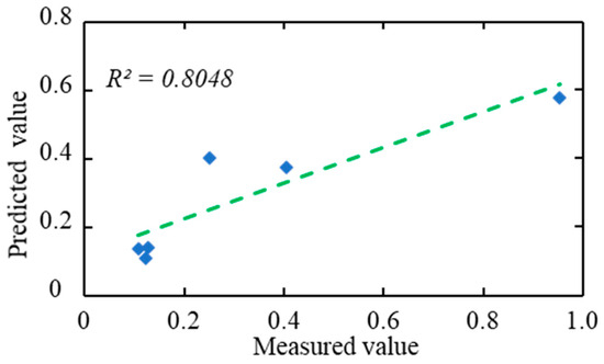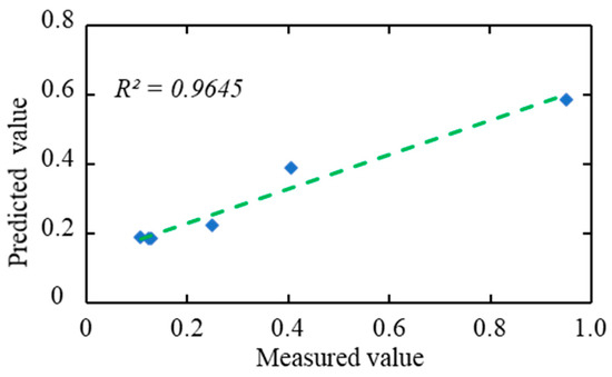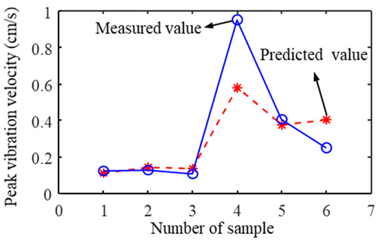 In this study, an SVR model with a penalty factor C of 15.2756 and kernel function deviation g of 0.6742 was employed, which is determined by the result of the fourth dataset. In contrast, utilizing the fitting equation based on the USBM formula resulted in test set indices of 0.0948, 0.0275, and 0.7877, respectively (Table 4). Comparing the results, the MAE increased by 7.78%, the MSE decreased by 8.37%, and the R2 increased by 22.44%. Figure 8 illustrates the curve representing the predicted and measured peak vibration velocities of the testing set, while Figure 9 depicts the comparison curve between the predicted and measured peak vibration velocities, with an impressive R2 value of 0.9645.