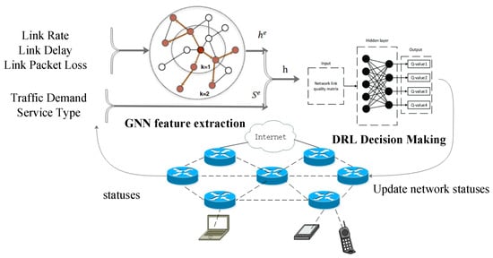 The network state is defined by link characteristics such as link delay, link capacity and current link utilization. These characteristics are stored in a fixed size vector filled with zero padding. At the beginning of a DRL event, a hidden feature vector representation of all nodes is generated by a graph neural network. When the DRL assigns a traffic demand to a specific path (that is, a sequence of links in the network), the network state changes. And the user state (including the source node , the destination node , and the traffic demand ) is added in the current network state. The ultimate goal is to reduce the average end-to-end delay and increase the network throughput at the end of the event (i.e., when the DRL agent iterates over all traffic demands).