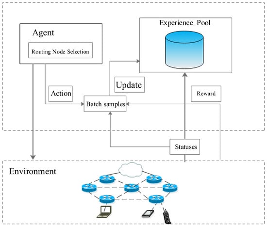 Figure 4 shows the model of the next node selection framework based on DQN which consists of three components: environment, agent and reward. The DRL agent is operated by interacting with the network simulation environment and the learning process is implemented by DQN. During execution progress, the node that saves the packet fixes its state and selects an action to determine the next hop node using DQN. After performing an action, the node receives a reward from its environment. During training, the centralized trainer draws a small random sample from the experience pool and updates its parameters by minimizing the loss of the DQN. After the parameters are updated, the centralized trainer sends the updated parameters to each node. Upon receiving the updated parameters, each node updates the parameters of its DQN. Then, the old experiences are deleted, and the new policy parameters are used to collect new experiences. This progress is repeated until convergence or a predefined criterion is reached.