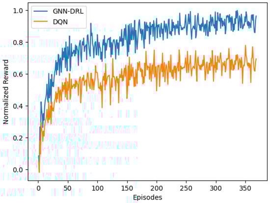 where and are the minimum and maximum rewards during online learning. The normalized reward curve is shown in Figure 6, and the results show that the cumulative reward of the GNN-DRL algorithm is better than that of the DQN algorithm.