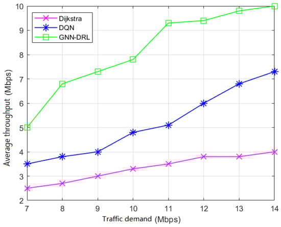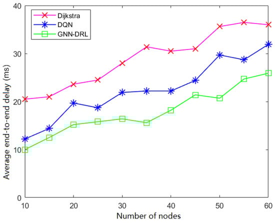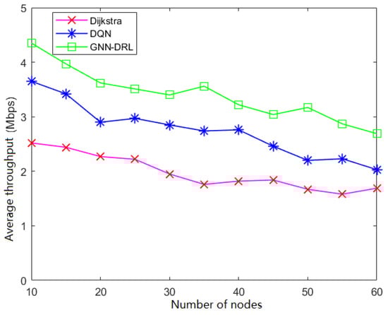 Figure 10 shows the simulation results of the average end-to-end delay of the network with the variation in the number of nodes. As the number of nodes in the network keeps increasing, the average end-to-end delay of the three algorithms keeps becoming larger. But it can be seen that the average end-to-end delay of the GNN-DRL algorithm proposed in this paper is always lower than that of the other two routing algorithms. At thirty nodes, the average end-to-end delay of the GNN-DRL algorithm is 30% and 22% lower than those of the Dijksta and DQN algorithms, respectively. Figure 11 shows the simulation results of the average throughput of the network with the variation in the number of nodes. As the number of nodes in the network increases, the average throughput of the three algorithms becomes smaller, but it can be seen that the average throughput of the GNN-DRL algorithm is overall higher than that of the other two routing algorithms.