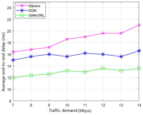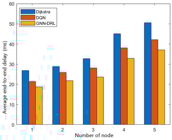 In order to evaluate the performances of Dijkstra, DQN and GNN-DRL algorithms with changes in the network topology, we consider a case in which there are node failures in the network. In this test, the NSFNet topology is disconnected with different numbers of selected nodes to simulate the network node failures in a real network operational environment. And the experimental results are shown in Figure 9. The GNN-DRL method proposed in this paper outperforms Dijkstra and DQN on topologies not seen in the training phase. It can be seen that GNN-DRL has better performance than that of the other two methods in coping with changes in the network topology and always has lower end-to-end delay than that of Dijkstra and DQN. The average end-to-end delay of GNN-DRL is reduced by 29.46% and 17.29% compared to Dijkstra and DQN, respectively. This proves that the GNN-DRL algorithm proposed in this paper can adapt to different network scenarios and can operate in highly dynamic networks (e.g., traffic variations, link failures and node failures), even if the network topology changes frequently in such a scenario.