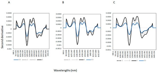 Average second derivative near-infrared spectra of black soldier fly larvae samples analyzed by comparing the different number of samples scanned. ((A) all samples; (B) supermarket waste; (C) childcare waste).