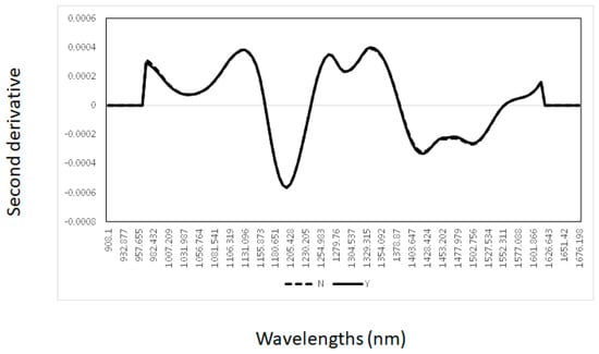 Average second derivative near-infrared spectra of black soldier fly larvae samples analyzed comparing the different aluminum foil (N: with aluminum foil; Y: with aluminum foil).