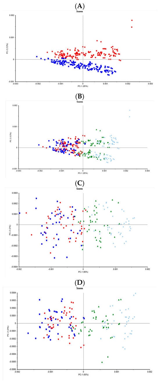 Principal component score plot of the black soldier fly larvae samples analyzed using near-infrared reflectance spectroscopy. Panel (A) is highlighted by waste stream (childcare and supermarket, irrespective of sample number), panel (B) is highlighted by sample presentation (number of larvae scanned for both waste streams), and panels (C,D) report the PCA score plot for the specific waste streams. (C) Childcare waste. (D) Supermarket waste. Blue: 0.5 larvae; Red: 1 larvae; Green: 2 larvae; Sky blue; 3 larvae.