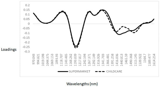 Principal component loadings of the black soldier fly larvae samples analyzed using near-infrared reflectance spectroscopy and sourced from two waste streams (e.g., supermarket and childcare).