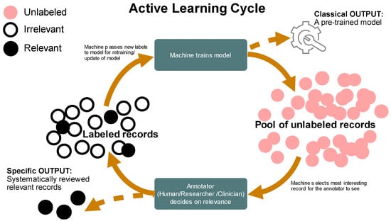 Developing a dataset of potentially relevant papers from a systematic search is an iterative process aimed at balancing recall and precision [6], including as many potentially relevant studies as possible (recall) while simultaneously limiting the total number of studies to be screened (precision). Since a single literature search can easily result in thousands of publications that must be read and screened for relevance, literature screening is extremely time-consuming [7]. Artificial intelligence can help to speed up the process of searching through large amounts of text data. Machine-supported pipelines have been developed that assist in finding relevant texts for search tasks; for overviews, see [8,9,10,11,12]. A well-established approach to increase the efficiency of title and abstract screening is screening prioritization [13,14] via active learning (AL) [15]: a constant interaction between a human and a machine; for an explanation, see Box 1 and Figure 1. Active learning is extremely effective in screening large amounts of textual data [9,14,16,17,18,19] and is successfully implemented in screening software like Abstrackr [17], ASReview [9], Colandr [18], FASTREAD [16], Rayyan [20], RobotAnalyst [21], Research Screener [22], DistillerSR [23], and robotreviewer [24]. Note that this is different from the classical notion of active learning in machine learning; see Box 2 for an explanation of the differences.