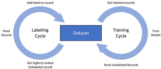 The process starts with a database search to obtain a dataset of unlabeled records containing meta-data such as titles, abstracts, and keywords of scientific papers. This is followed by constructing an initial labeled training set, where the labels are provided by the annotator. This consists of at least one labeled relevant and labeled irrelevant record. Next, an active learning model needs to be selected, including a feature extraction technique, a classification algorithm (i.e., a machine learning model), a query strategy, and a balancing strategy to deal with the extreme imbalance between the number of relevant and irrelevant records in the data. Then, the active learning cycle starts (see also Figure 1):