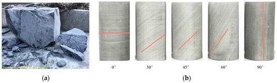 The shale cores used in the experiment were taken from a traffic tunnel in a shale formation in the western Hubei province, China. The large shale blocks, as shown in Figure 1a, were selected at the tunnel construction site and were drilled to obtain shale cores, and then the cores were cut and polished into standard cylindrical shale samples. The diameter and height of the prepared cylindrical shale samples are 50 mm and 100 mm, respectively, and the flatness deviation at both ends of the samples is within 0.02 mm, whereas the deviation along the height direction does not exceed 0.1 mm. At the same time, in order to determine the anisotropic mechanical properties of shale, the angle θ between the static loading direction and the normal direction of the bedding planes of the shale samples was defined as the bedding angle. Shale samples with bedding angles of 0°, 30°, 45°, 60°, and 90° were prepared, and there were 15 samples for each bedding angle, as shown in Figure 1b.