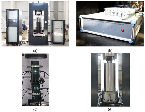 The uniaxial and triaxial loading tests were carried out on the prepared shale samples by using the TAW-2000 rock triaxial testing machine, as shown in Figure 3a, and the samples were fully dried before the test. In the test, the radial strain of the samples was collected by a chain extensometer, while the axial strain was collected by axial extensometers matched to the triaxial testing machine, which were set at the middle height position of the samples. In addition, a DS-5 acoustic emission (AE) instrument, as shown in Figure 3b, was used in the uniaxial test to record the AE signals during the uniaxial loading, and the AE recording probes were installed on the surface of the samples, as shown in Figure 3c. It is worth noting that due to the limitation of the space inside the confining pressure loading cylinder in the triaxial test, as shown in Figure 3d, the AE signals of the samples were not collected during the triaxial test.