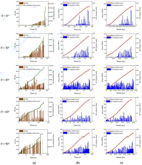 Uniaxial compression and AE test data of shale samples with different bedding angles: (a) Relationship between time, AE hits, and AE cumulative hits; (b) Relationship between time, stress, and AE ringing counts; (c) Relationship between strain, stress, and AE ringing counts.