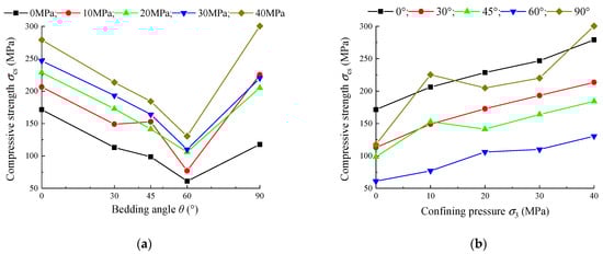 As shown in Table 2 and Figure 6a, the compressive strength σcs of the shale samples exhibits significant anisotropy, and σcs under the same confining pressure σ3 shows a “U-shaped” trend of first decreasing and then increasing with the increase in the bedding angle θ. Secondly, the minimum value of σcs of shale samples with or without confining pressure σ3 is achieved at the bedding angle of 60°, which is consistent with the experimental results of other researchers [,,]. On the other hand, with the increase in confining pressure, the bedding angle θ corresponding to the maximum value of σcs tends to change from 0° to 90°. When confining pressure σ3 is between 0 MPa and 30 MPa, the bedding angle corresponding to the maximum value of σcs is obtained at 0°, while at the higher confining pressure of 40 MPa, the maximum value is obtained at a bedding angle of 90°. It can be seen that the sensitivity of σcs to the confining pressure under different bedding angles is different.