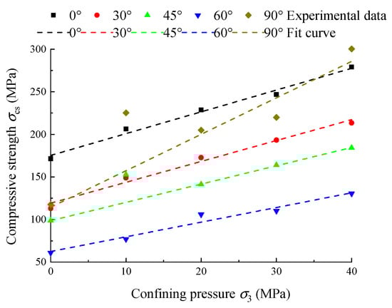 As can be seen from Table 3, R-square values are all greater than 0.95, indicating that the linear relationship between shale compressive strength σcs and confining pressure σ3 is very significant after removing some abnormal data. The fitting curve and the measured data are drawn in Figure 7, and it is not difficult to find that due to the difference in the sensitivity coefficient of bedding angle θ, the critical point of confining pressure is about 35 MPa between the shale compressive strength at a 90° bedding angle and the shale compressive strength at a 0° bedding angle. When the confining pressure σ3 is near the critical point, the bedding angle corresponding to the maximum shale strength will be transformed.