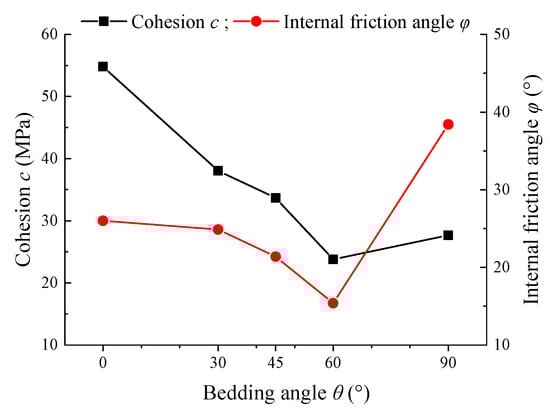 Figure 8 shows the variation of the cohesion c and the internal friction angle φ of the shale samples with the bedding angle θ. It can be seen that the c and φ of samples decrease first and then increase with the increase in the bedding angle θ, and both obtain the minimum value when the bedding angle θ is 60°, which is the same as the variation of compressive strength σcs with the increase in bedding angle θ. The difference is that the maximum cohesion c obtained when θ is 0°, while the maximum internal friction angle φ is obtained when θ is 90°.