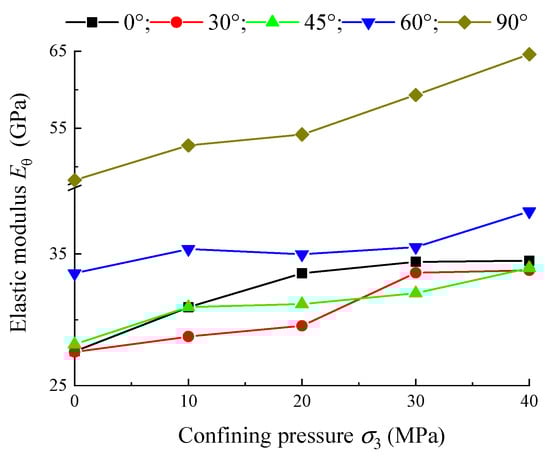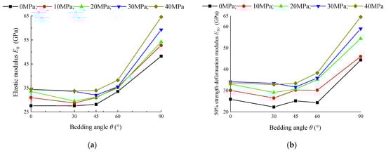 On the other hand, according to the data in Table 5, the variation curves of elastic modulus Eθ and 50% strength deformation modulus E50 of shale samples with bedding angle θ under different confining pressures σ3 are drawn, as shown in Figure 12.
