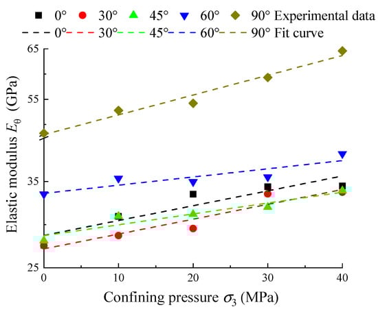 It can be seen from Table 7 that the fitting index R-square of linear fitting between the elastic modulus Eθ and confining pressure σ3 of shale samples with different bedding angles are close to or greater than 0.8, indicating that Eθ and confining pressure σ3 basically obey a linear relationship. The comparison between the linear fitting function and the experimental results is sorted out, as shown in Figure 10. It can be observed that the sensitivity of the Eθ to the confining pressure effect is different under various bedding angles. Combined with the sensitivity coefficients in Table 3 and Table 7, it is found that the variation of shale elastic modulus Eθ sensitivity to confining pressure σ3 with bedding angle θ is very similar to that of the compressive strength σcs sensitivity. The sensitivity coefficient C decreases slowly in the bedding angle θ range of 0°~60°, and the growth of elastic modulus Eθ decreases gradually with the increase in confining pressure σ3, while the sensitivity coefficient increases rapidly in the range of 60°~90°, showing that the growth of Eθ increases rapidly with the confining pressure σ3.