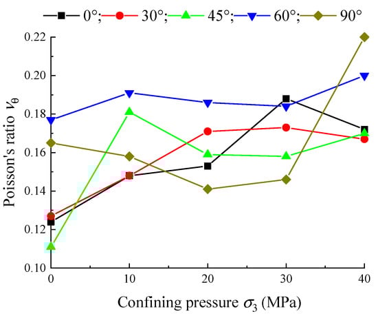 In addition to the elastic modulus Eθ, Poisson’s ratio is also a very important elastic constant, and the variation curves of Poisson’s ratio vθ and confining pressure σ3 of shale samples obtained by uniaxial and triaxial tests are shown in Figure 11, and it can be found that the variation of Poisson’s ratio vθ of shale with confining pressure σ3 is disordered. According to the transverse isotropic properties and the experimental scheme, the Poisson’s ratio vθ of shale samples with a bedding angle of 0° measured by the chain extensometer is a constant, while the vθ measured by the samples with other bedding angles are all mixed data of vθ in different directions. Therefore, only the relationship between vθ and confining pressure σ3 for samples with a bedding angle of 0° is discussed. As shown in Figure 11, vθ and σ3 for shale samples with a bedding angle of 0° are approximately positively correlated.