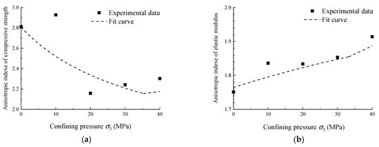 According to the anisotropic indexes of the compressive strength σcs of the shale, combined with the anisotropic grading standard in Table 8, it is determined that the shale has a moderate degree of anisotropy. In the confining pressure σ3 range of 0~40 MPa, the bedding angle θ corresponds to the extreme values of the compressive strength σcs and elastic modulus Eθ of shale changes, which increases the complexity of analyzing the anisotropy. The fitting curves of the anisotropic indexes of σcs and Eθ with σ3 are sorted out, as shown in Figure 13, and the functional expressions of the fitting curves are shown in Equations (5) and (6).