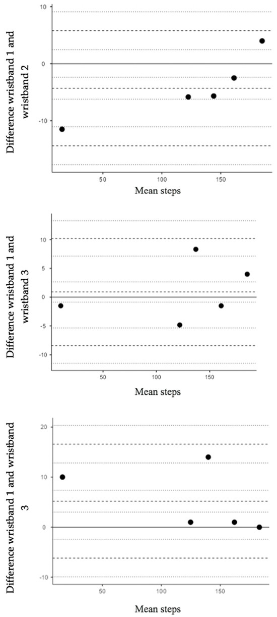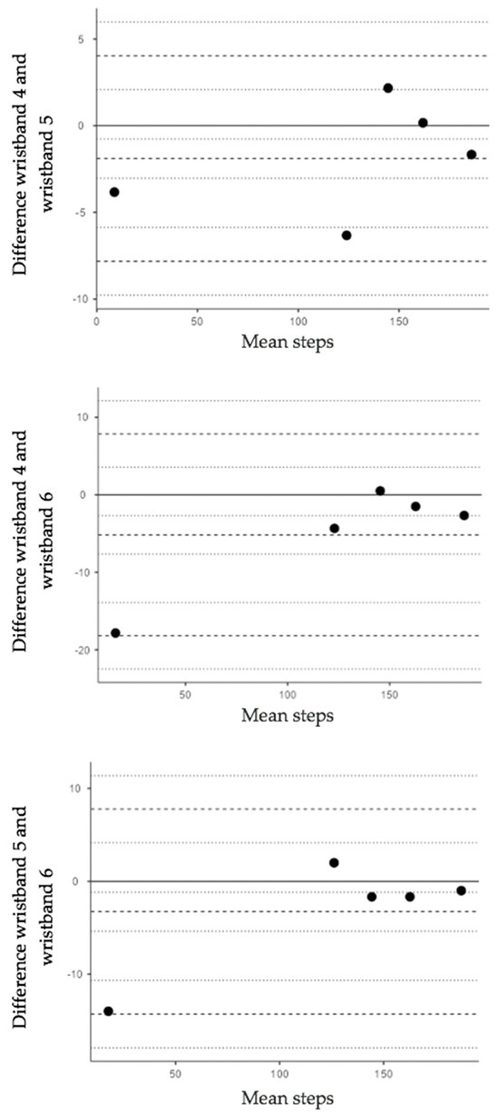 The step measurement in Table 4 shows the narrowest limits for Wristband 4 vs. Wristband 5 (11.86 steps) and the widest limits for Wristband 4 vs. Wristband 5 (26.02 steps). In the measurement of minutes of PA, the table showed the narrowest limits for Wristband 4 vs. Wristband 5 (0.27 min) and the widest limits for Wristband 1 vs. Wristband 3 (0.8 min). The results from the Bland-Altman analysis show errors not exceeding 6 steps and not exceeding 0.11 min in MVPA.