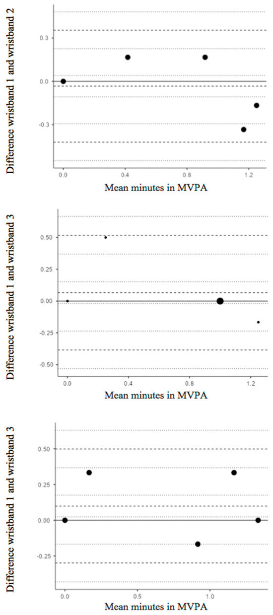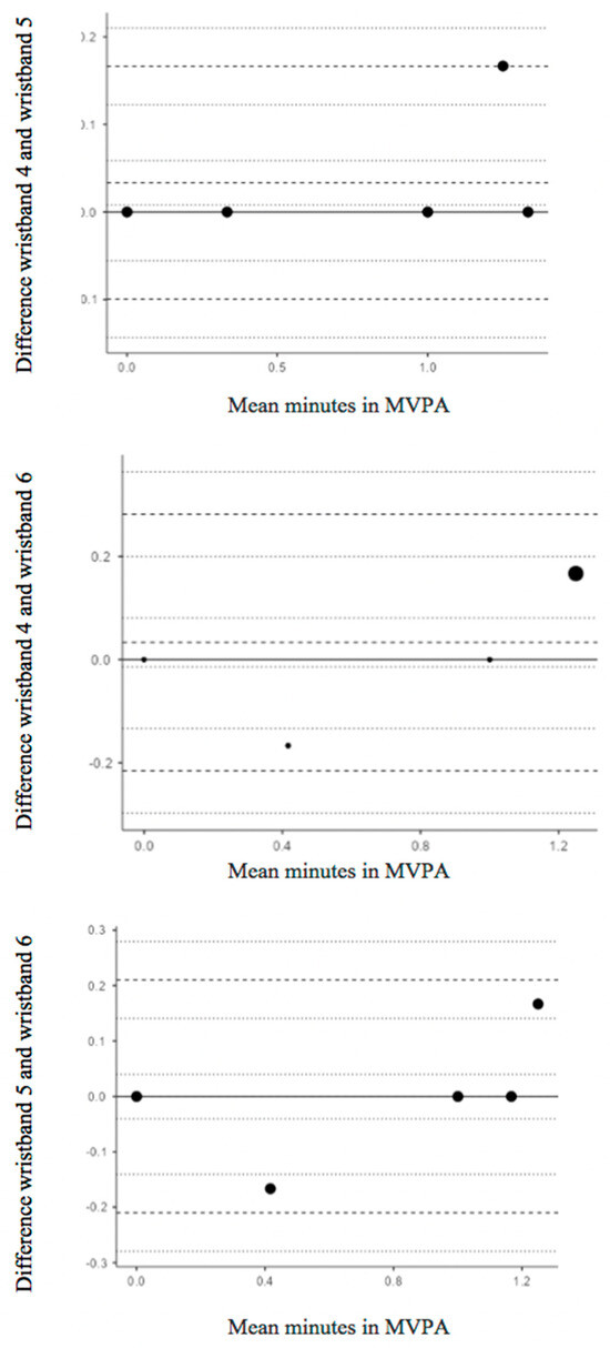 Figure 3 and Figure 4 show the Bland-Altman plots indicating the differences between the wristbands concerning PA minutes and the limits of agreement.