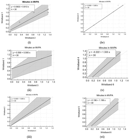 Scatterplot between wrist bands using Passing and Bablok regression for the variable minutes in MVPA: (i) wristband 1 vs. 2; (ii) wristband 1 vs. 3; (iii) wristband 2 vs. 3; (iv) wristband 4 vs. 5; (v) wristband 4 vs. 6; (vi) wristband 5 vs. 6. The black line represents the regression line, the shaded area is the confidence interval for 95% of the regression line, and the discontinuous grey line is the perfect regression line.