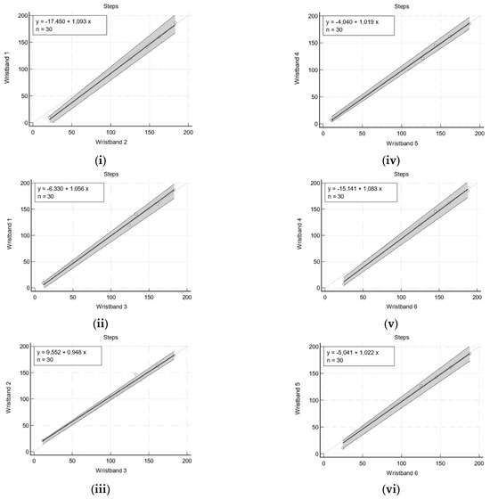 Scatterplot between wristbands using Passing and Bablok regression for the variable steps: (i) wristband 1 vs. 2; (ii) wristband 1 vs. 3; (iii) wristband 2 vs. 3; (iv) wristband 4 vs. 5; (v) wristband 4 vs. 6; and (vi) wristband 5 vs. 6. The black line represents the regression line, the shaded area is the confidence interval for 95% of the regression line, and the discontinuous gray line is the perfect regression line.