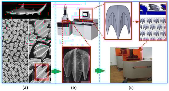 Fast-swimming shark skin manufacture. (a) ESEM images [33], (b) scan data, (c) model reconstruction.