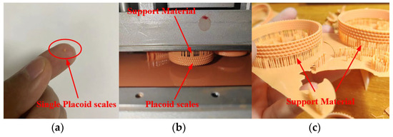 In this paper, to reconcile actual requirements and machining precision, we have increased the placoid scales by approximately 10 times. This scaling ensures precision in processing and results in a placoid-scale morphology characterized by distinct three-dimensional features. The 3D printing process of the placoid scales is depicted in Figure 2, with the individual placoid scales in Figure 2a and the completed product in Figure 2b. The support materials utilized during the 3D printing process are depicted in Figure 2c.