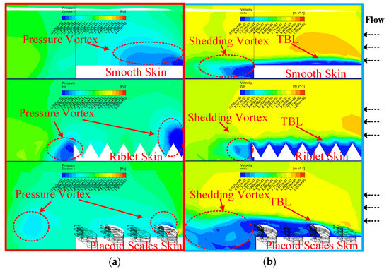 Figure 5a shows the pressure distribution of the smooth, riblet, and placoid-scale skin in the flow fields.
