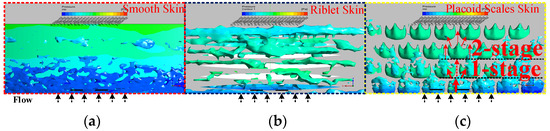 To illustrate the vortex alterations as fluid flows through various skin surfaces, Figure 6 presents the vortex diagrams for the flow fields of smooth, riblet, and placoid-scale skin.