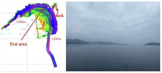 The experiment was conducted in Thousand Island Lake, Zhejiang Province, China. Following preliminary investigation, the northwestern lake area of Thousand Island Lake was selected because it is not a primary navigation channel and exhibits fewer background noise interferences. The majority of the experiment area has a depth of approximately 40 m, with a maximum depth of approximately 60 m. Figure 7 illustrates the experiment environment.