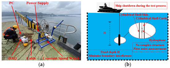 The experimental apparatus primarily consisted of a constant-speed winch, an RHCA-14 hydrophone, a signal acquisition card, a dedicated hydrophone power supply, and a PC, as partially depicted in Figure 8a. The experimental sketch is illustrated in Figure 8b. The hydrophone exhibited several parameters, which were as is shown in Table 3.