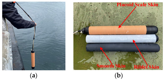 During the experiment, the constant-speed winch raised three types of cylindrical shells with varying skin (smooth, riblet, and placoid scales) at a fixed speed (0.833 m/s). The experiment process in Figure 9a, and different skin objects are shown in Figure 9b.