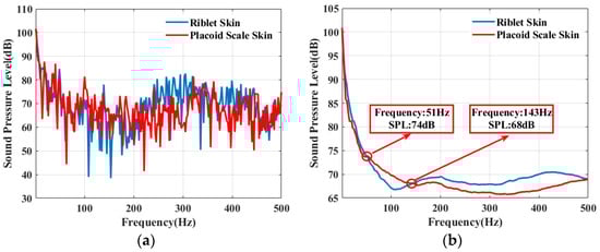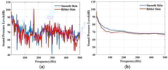 The comparison results between smooth skin and the riblet skin are illustrated in Figure 12, where the blue curve represents the smooth skin and the red curve represents the riblet skin. In the 0–500 Hz range, the riblet skin demonstrated a notable reduction in low-frequency flow noise at 72 Hz, achieving a noise reduction of more than 4 dB. This indicates that flow noise may be influenced by factors such as the structure of the riblet skin.