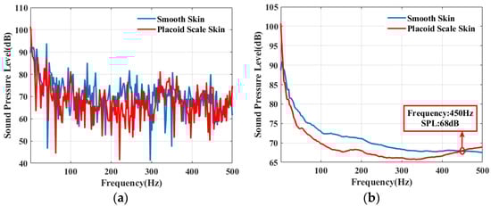 Figure 13 presents the comparison between the smooth skin and the placoid-scale skin. The blue curve represents the smooth skin, while the red curve represents the placoid-scale skin. In the 10–450 Hz range, the placoid-scale skin significantly reduced low-frequency flow noise, with a reduction of 5 dB observed at 150 Hz. However, between 450 and 500 Hz, the placoid-scale skin increased the flow noise.
