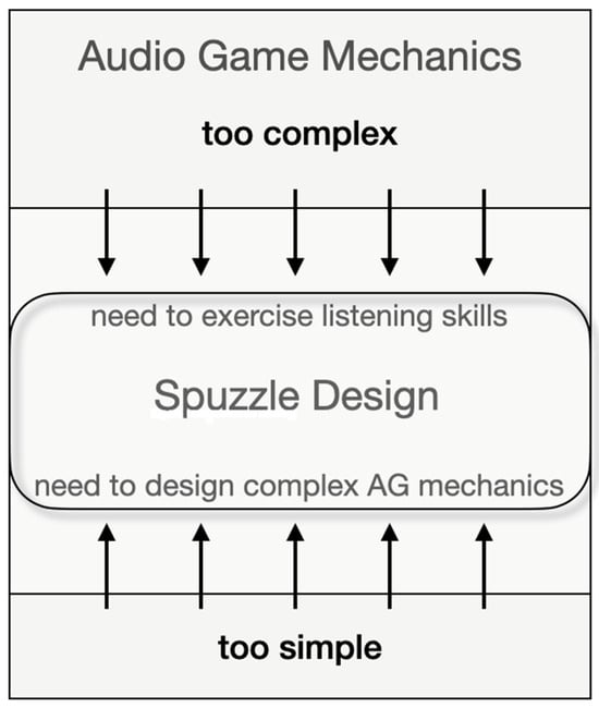This research aims to contribute to AG design research by investigating a new design approach for AG mechanics proposed by the authors, which employs the acoustic properties of speech for shaping puzzles that challenge players’ different listening modes. As proof of concept, the game “Break the Audio Code” was designed to demonstrate different facets of this “spuzzles” (speech + puzzles) approach, from using unprocessed speech recordings to complementing them with background sounds, and from applying simple editing actions to heavily manipulating the recordings via audio effects, in order to engage players’ semantic, causal, and reduced listening. The acceptance of spuzzles was evaluated in a playtesting session and a consequent semi-structured discussion by a focus group comprised of seven students of the Audiovisual Arts Department of the Ionian University in Greece. The authors are aware of the limitations of their research, since the number of the participants is small, their profile similar, and no quantitative data were analysed. In this research, a qualitative research approach was employed aiming to provide preliminary insights regarding the perception of spuzzles that could serve as the basis for their future systematic design and utilisation. Since spuzzles employ different listening modes and thus exercise players’ listening skills, they could be used to address the aforementioned challenge that sighted players are failing to cope with complex AG mechanics (Figure 1).