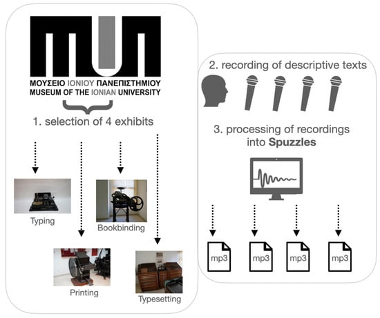 This section analyses the design of the four spuzzles of the AG “Break the Audio Code” designed by the authors for the purpose of this research. The content of the game was sought in the typography collection of the Ionian University Museum in Corfu, Greece. The collection is situated at the Ionian University Department of Archives, Library Science, and Museology, and exhibits machines, tools, and objects related to various phases of the production of printed or typed archival material. More specifically, the exhibits fall under the categories: (i) typesetting, (ii) printing, (iii) bookbinding, and (iv) typing. One exhibit was selected from each of those categories, and a descriptive text was provided by the museum for each of the selected exhibits. The texts were narrated and recorded by the corresponding author (male voice), and these recordings served as raw material for the creation of four respective spuzzles (Figure 2).