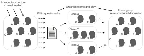 It must be noted here that after filling in the technographic questionnaire, participant B had to unexpectedly leave for a while. Based on the questionnaire findings, the authors divided the six remaining participants into the three following teams and decided that if participant B returned, he would join team Y (Figure 3):