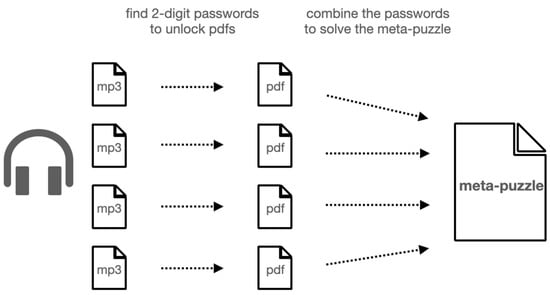 Regarding the fifth document, the inclusion of a meta-puzzle as the endgame is a very common technique in puzzle organisation [48]. Players are presented at once with several subsets of the meta-puzzle as prerequisites for the final solution and can solve them in any order they wish (Figure 4). The authors implemented this strategy in structuring the game for two important reasons. First, a linear path for solving the puzzles would pose the danger that the latter would not be examined if the former were not solved. A non-linear meta-puzzle gives players motivation and freedom to plan their own strategy, whereas the opening of the in-between pdfs essentially reports on their progress. Second, to solve the meta-puzzle, players need to consider the chronological order of the exhibits, and in doing so they engage with their cultural context. This is aligned with a crucial factor proposed in the literature for enhancing learning in the field of virtual heritage, namely to establish a relationship between users, virtual content, and cultural context [49].