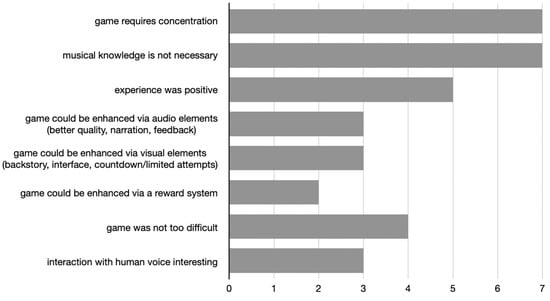The state of concentration has been frequently connected to AG experiences, not only in terms of a required condition for game progress but also as a skill that players can develop through the process [22]. Focusing on sound’s learning affordances, Bishop, Amankwatia, and Cates, among others, report increased attention and the exclusion of distractions, yet they argue that, however frequent, sound’s use in learning environments deals with the literal conveyance of information, while neglecting the associative potential that would facilitate a deeper study of the learning material [52]. The participants in this research seemed to comprehend the multifaceted dimension of the game’s audio content. They recognised and sought for other aspects of the audio content besides the meaning of speech, such as background stimuli, disturbances, pauses, repetitions, and stereo positioning. Afterwards, they discussed and criticised the perceived sound properties in detail. Moreover, they seemed appreciative of the fact that the game’s mechanics relied solely upon their acoustic perception and not their musical knowledge. This instilled a feeling of justice in the experience, i.e., all players were equal, since all that was needed was to employ one’s everyday listening skills. However, the authors see two sides in that condition. On the one hand, the exclusion of musical requirements can indeed provide a more open framework in terms of player address. On the other hand, it cannot be ignored that the winning team was comprised of the two participants who felt the most confident in their music and audio technology skills.