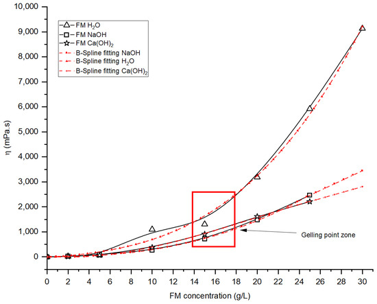 The viscosity range of mucilaginous solutions was established using a rheometer (DVNext, Brookfield, Toronto, ON, Canada) with appropriate HA/HB spindles ranges. Mucilaginous solutions were prepared to obtain seven solutions at different concentrations (2, 5, 10, 15, 20, 25, and 30 g/L) by solubilizing FM into tap water, NaOH 0.04 M, and Ca(OH)2 0.02 M at 400 rpm until all the FM was solubilized. The viscosity values were obtained at different spindle rotational speeds from 20 to 200 rpm. The designated viscosity value corresponds to a constant rotational speed of 60 rpm, corresponding to the most adequate torque generated for all solutions. At 60 rpm, the torque value during the experiment was optimal (between 40 to 60% of the maximum torque tolerated by the instrument). At higher speeds, the torque was in the low range of the apparatus, while torque values that were too high were obtained at speeds lower than 60 rpm.