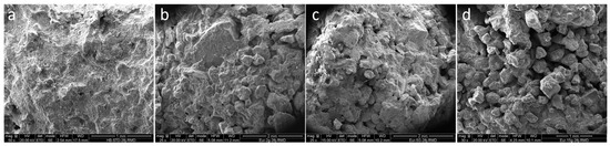 Granular shape of 28 days cured mortars—(a) reference, (b) EURO2G, (c) EURO5G, and (d) EURO15G.
