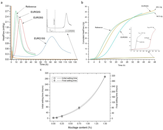 Setting times determination: The polysaccharide has the ability to bind with cement cations and absorb an amount of mixing water necessary to the cement for hydration and hardening. The Figure 5 illustrates the isothermal calorimetry of the polysaccharide admixed cement pastes. Zhang et al. [40] worked on the retarding effect of saccharides on cement pastes and concluded that the initial and final setting times increased exponentially as a function of the sugar concentration. To confirm these results, an additional cement paste, with 30 g/L mucilage mixing water (1.5% w/w cement), was used. The results are shown in Figure 5a–c.