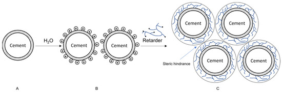 Schematic representation of the retardant barrier formation mechanism and the increase in steric hindrance. (A) Anhydrous cement grain, (B) formation of cationic sites on the surface of the cement grain, and (C) bonding of retarder and formation of a semi-permeable barrier around the cement grains.