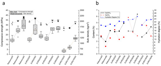 Compressive strength and bulk density (dispersed stars) (a) and hydration degree and hydrates contents (b) of 28-, 60-, and 90-day cured mortars.